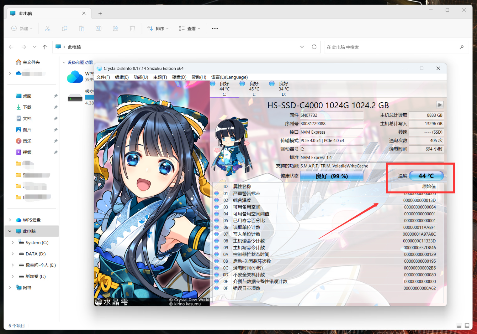 根据CrystalDiskInfo显示,室温为27度的时候,常态低负载状态温度为44°左右,也是这套方案的常规水平。