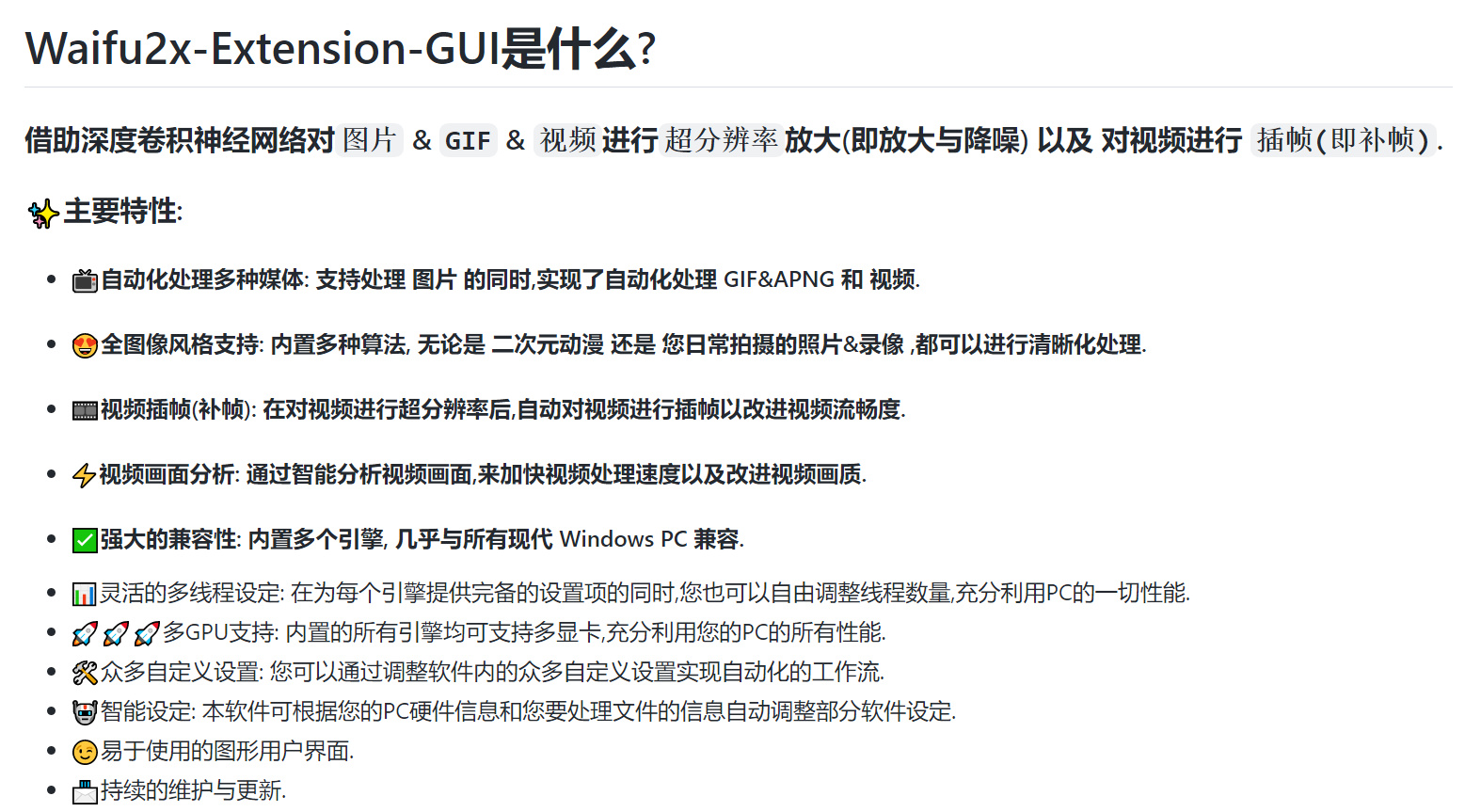 所幸最终找到了一款图形化的开源软件,内置了Real-ESRGAN、waifu2x、Anime4K等多种AI算法引擎,对图片、GIF动图和视频都能一键放大修复,还提供了视频补帧功能,功能强大,完全免费,堪称业界良心,在此赶紧分享给大家。