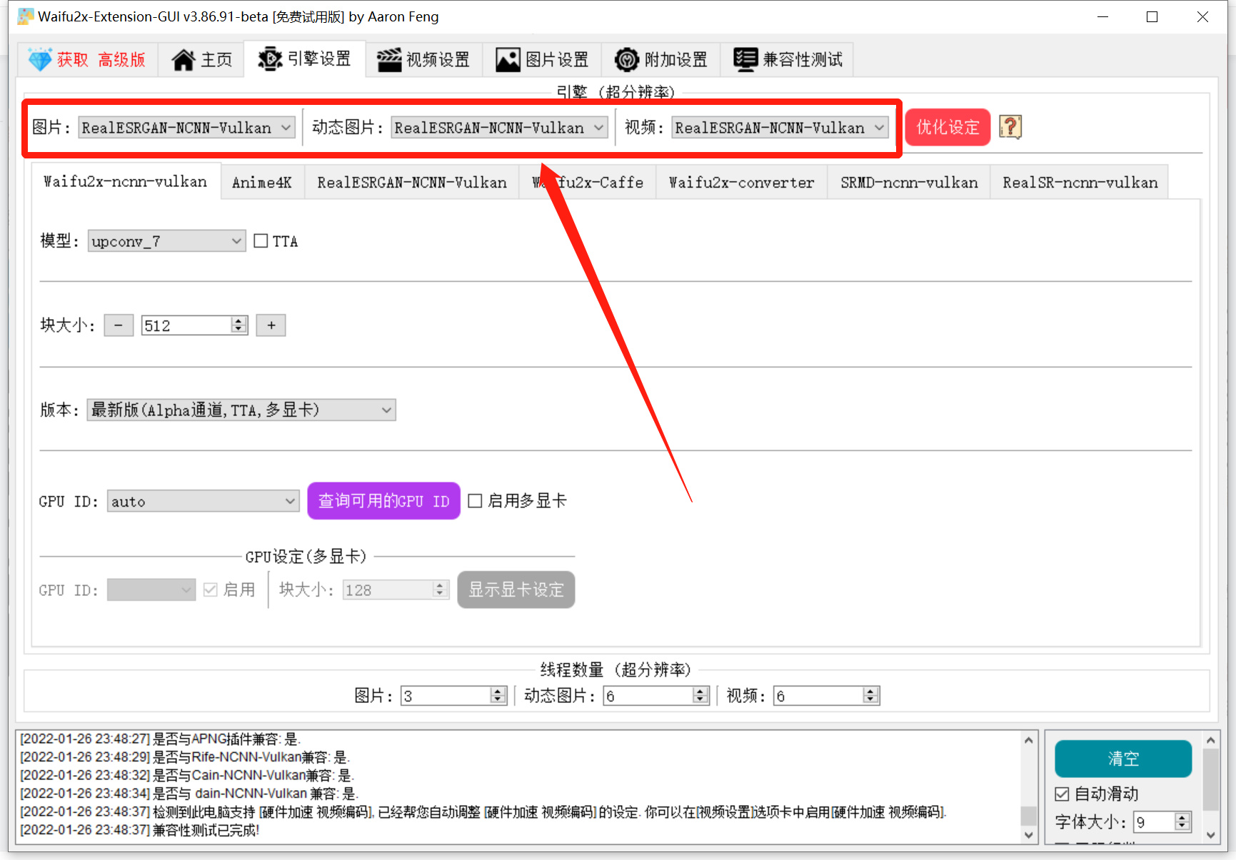 需要注意的是,Real-ESRGAN只有对静态图片、GIF动图和视频的放大、降噪功能,无法用于视频补帧。使用视频补帧功能后,这里的默认引擎会发生变化,记得及时调整回来。