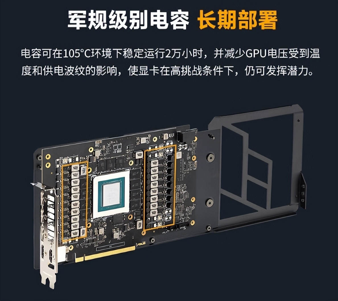 ▲华硕品质,坚如磐石不是白说的,TUF-GeForce RTX4090-O24G-GAMING采用了军规级别的电容,即使在105°C的高温环境下依旧能够稳定运行2万个小时,同时能够提供稳定的电压,保证GPU能够稳定运行。