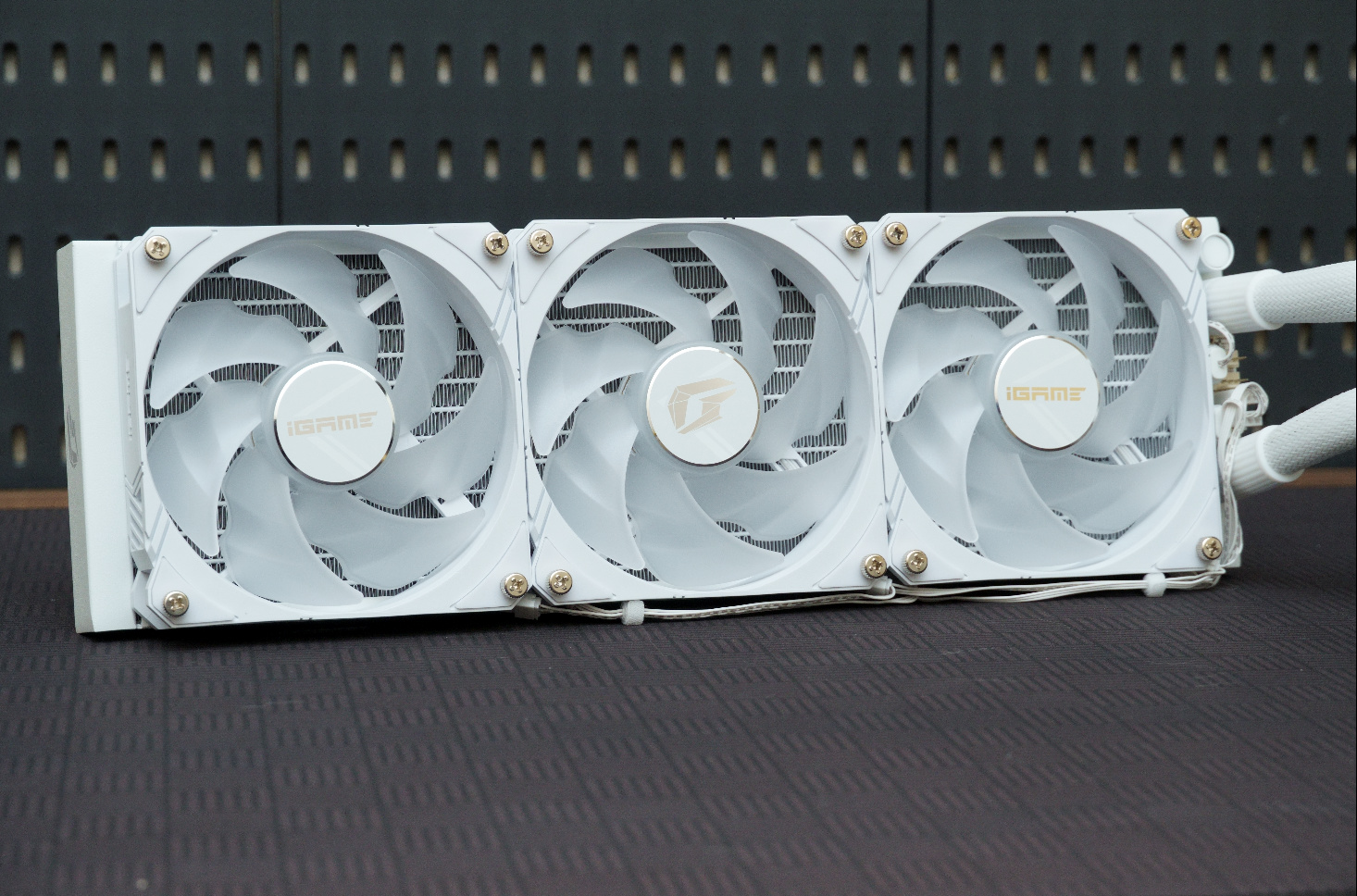 ▲采用360冷排的冰海散热器拥有3个120mm静音风扇,中间的一个印有iGame图形LOGO,左右两个则印有iGame英文LOGO,也是信仰满满。
