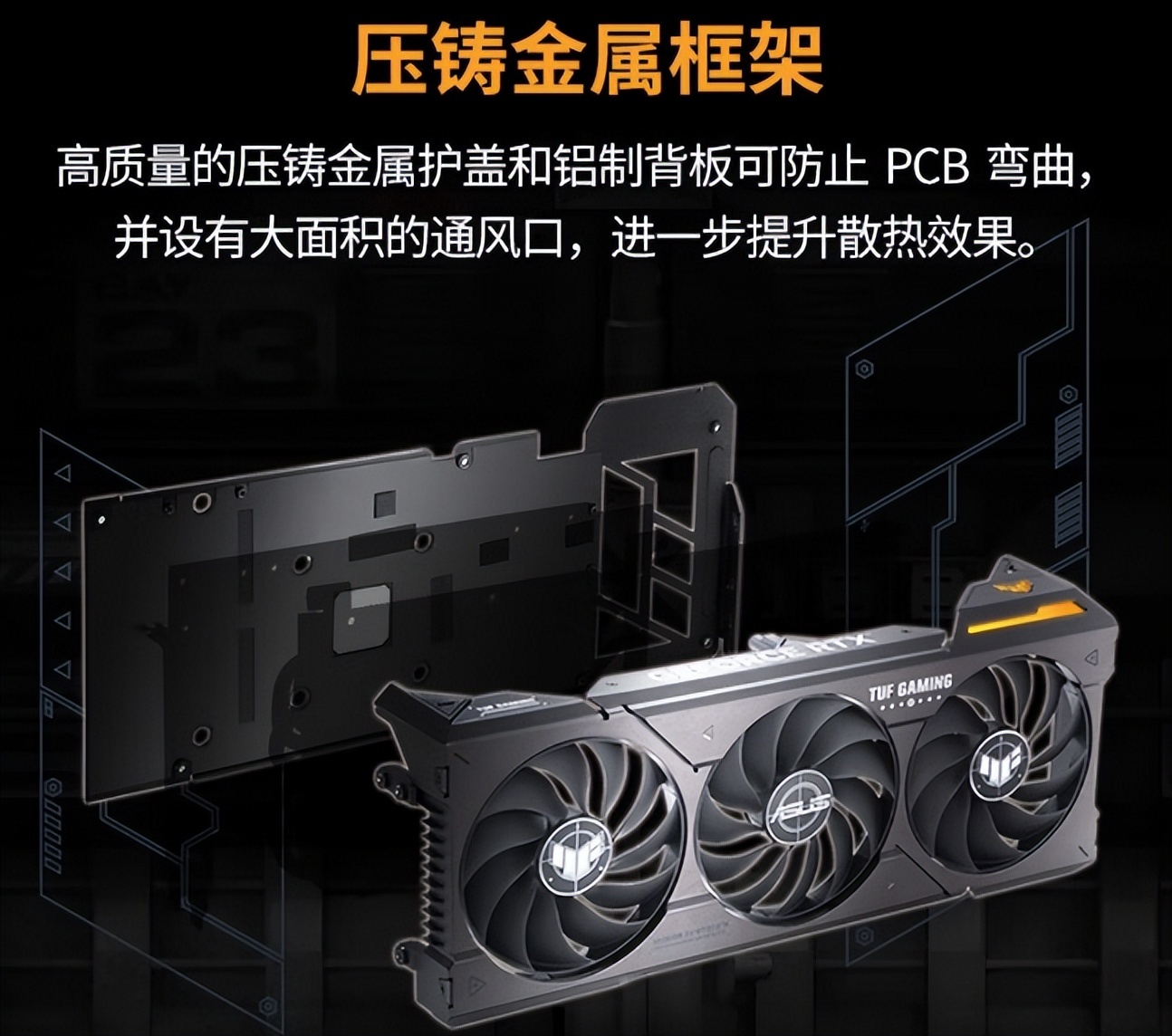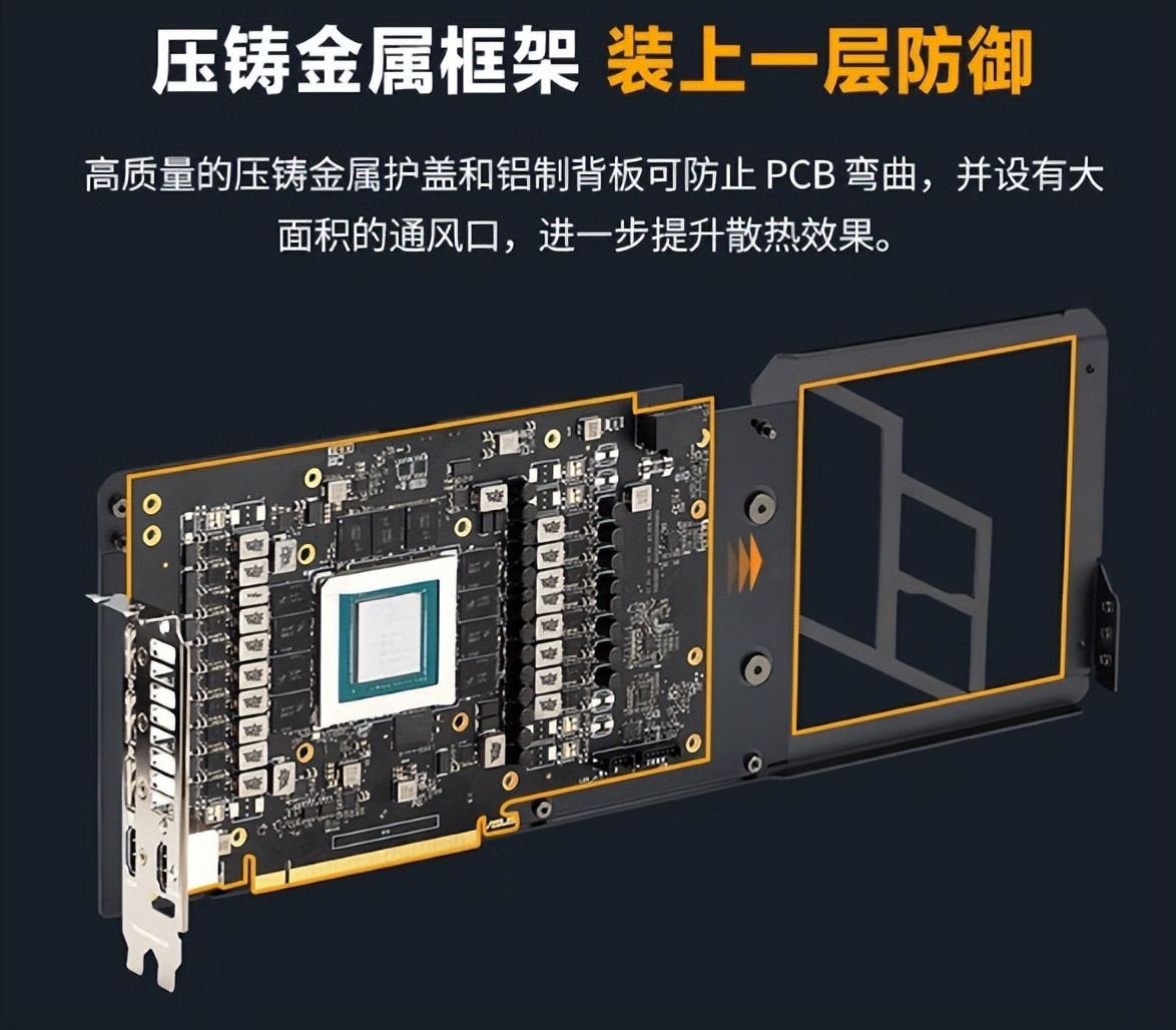 ▲这款显卡采用了压铸金属框架,可以防止PCB弯曲,并大幅提升散热效果。