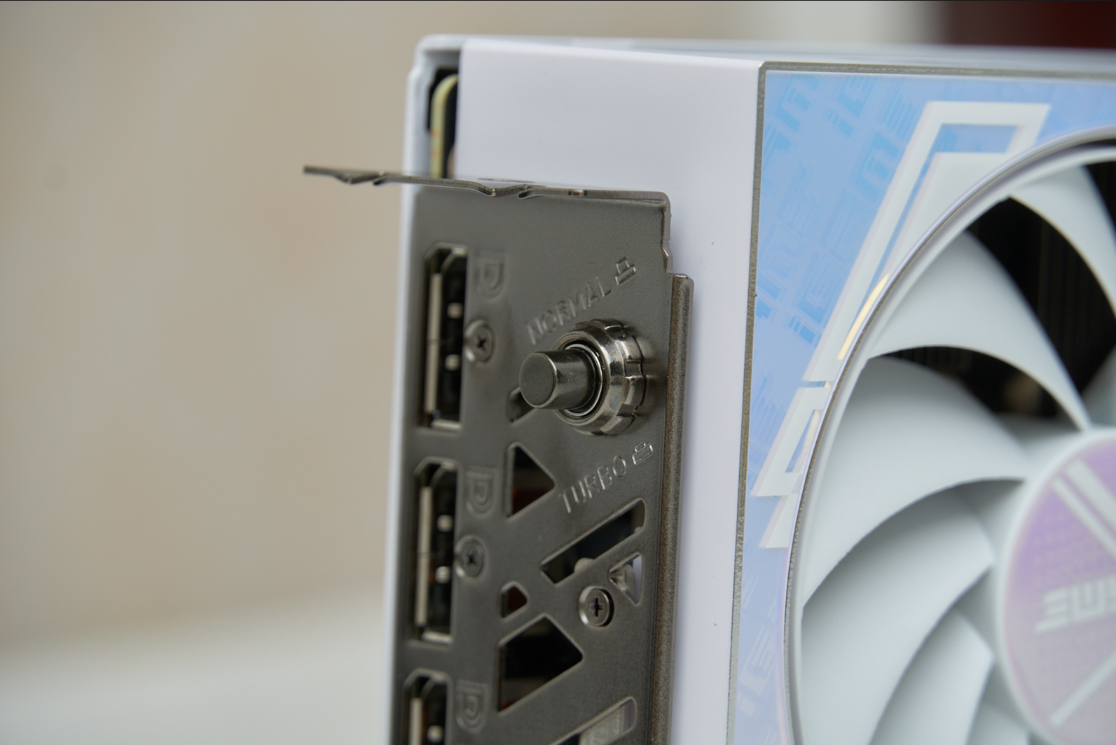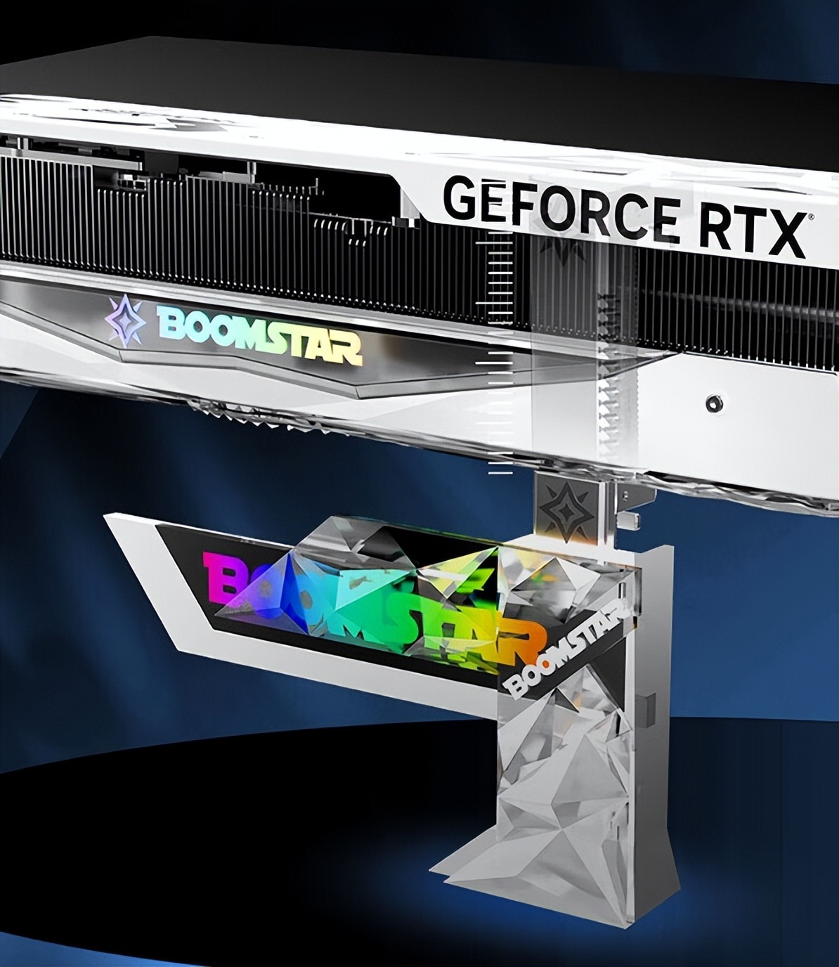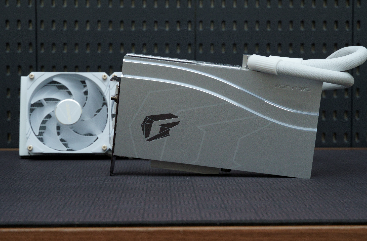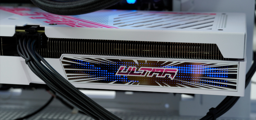 ▲书归正传,白色的显卡本体配上额外赠送的白色RGB显卡支架,在机箱内会很吸睛,十分适合纯白色主题装机。