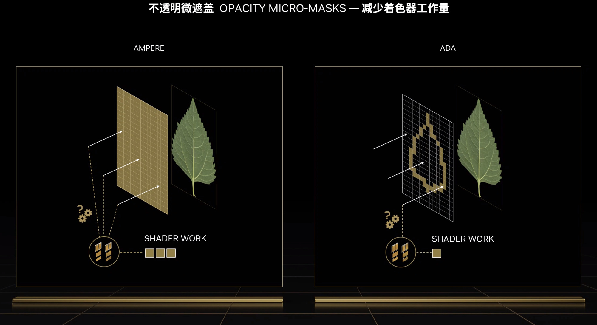 ▲而OMM 引擎可大幅提升对 alpha 测试纹理进行光线追踪的速度,以树叶为例,全新ADA架构RT Core搭载的OMM引擎可将树叶分为全透明部分,不透明部分与半透明部分,大幅减少着色器工作量,进而明显降低光线追踪对游戏性能的影响。