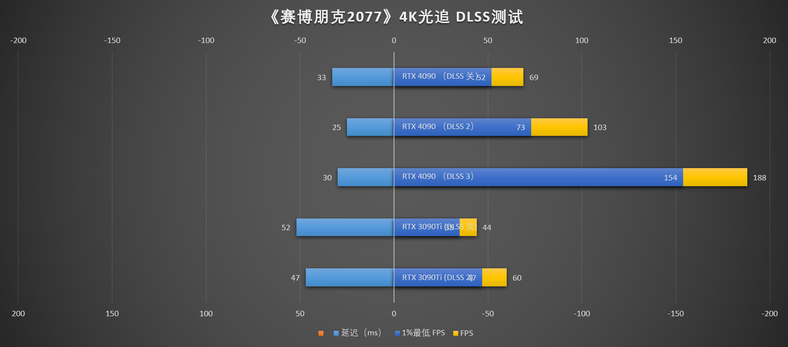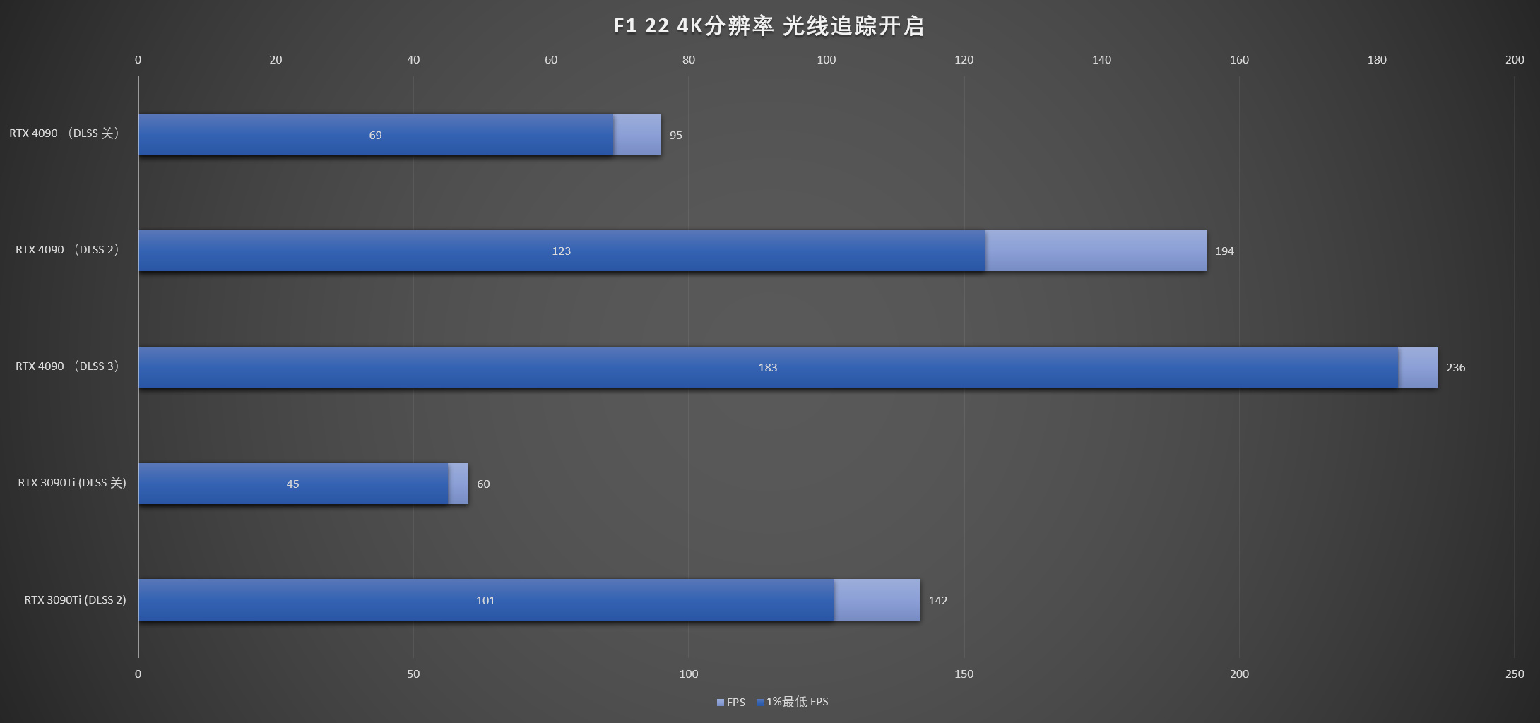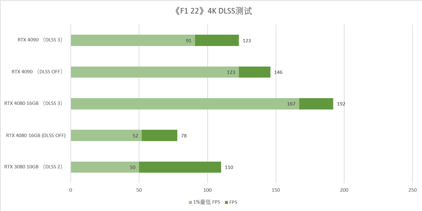 ▲在DLSS3的加持下,《赛博朋克 2077》,光追超级(ULTRA)画质下,RTX 4090依旧能够提供188 FPS的高帧率,在《F1 22》中更是跑到了236 FPS的超高帧率,均超过了目前4K 高刷显示器的刷新率,可以说这一轮是显卡走在了显示器前面。