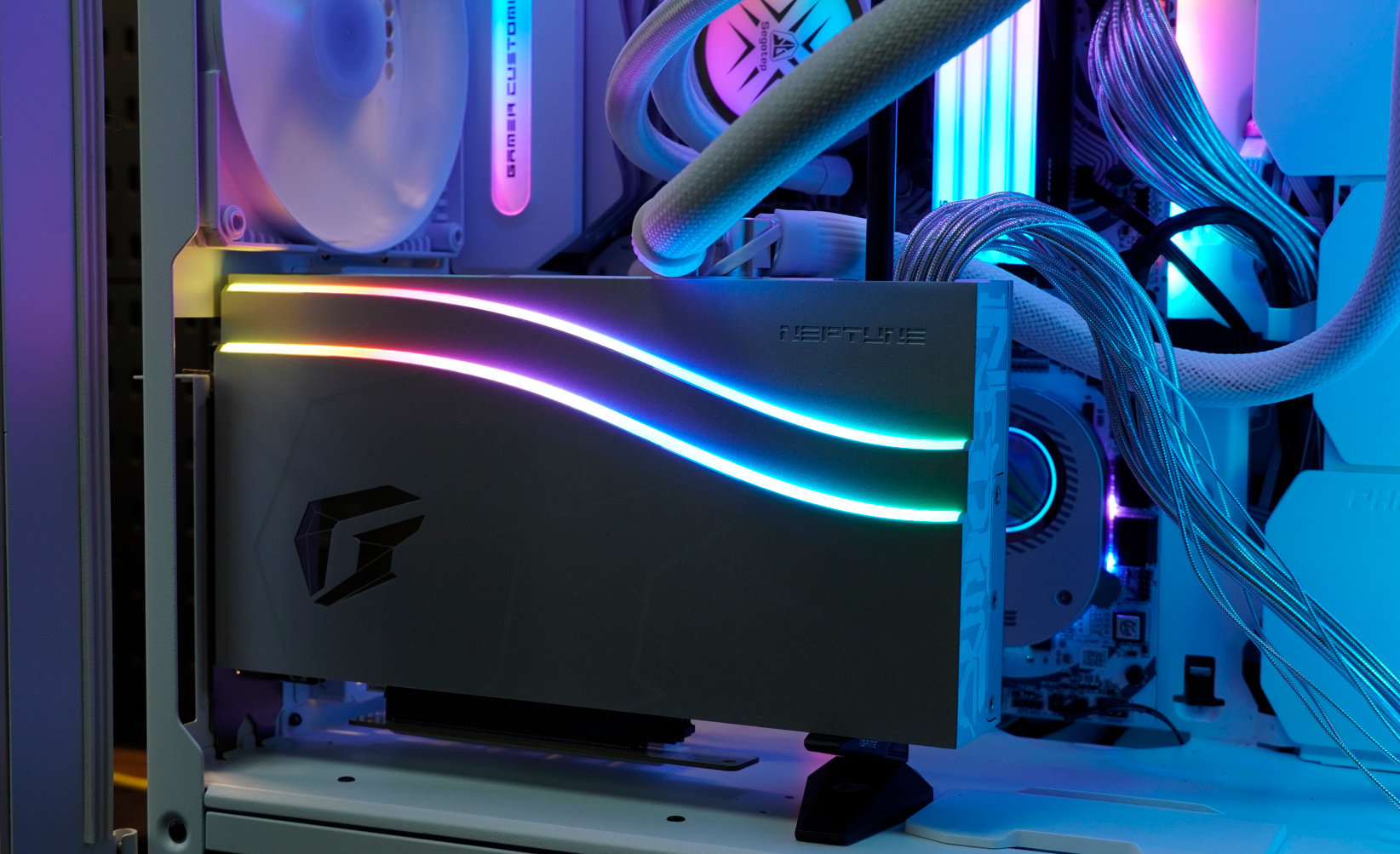 ▲这里还是首先推荐自己首测时使用的七彩虹iGame GeForce RTX 4090 Neptune OC,iGame Neptune系列显卡从30系的黑色变为白色,iGame Neptune的标志性特征由圆环形的海洋之眼进化成为了双波浪曲线,iGame产品设计师以水流为灵感所特别设计,遵循着水流的运动节奏打造全新的视觉语言。