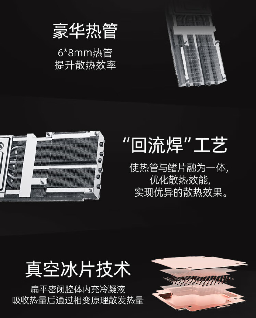 ▲这款显卡在用料上也下足了血本,豪华热管搭配”回流焊“工艺,再辅以真空冰片技术,散热性能十分强劲,保证显卡的运行稳定。