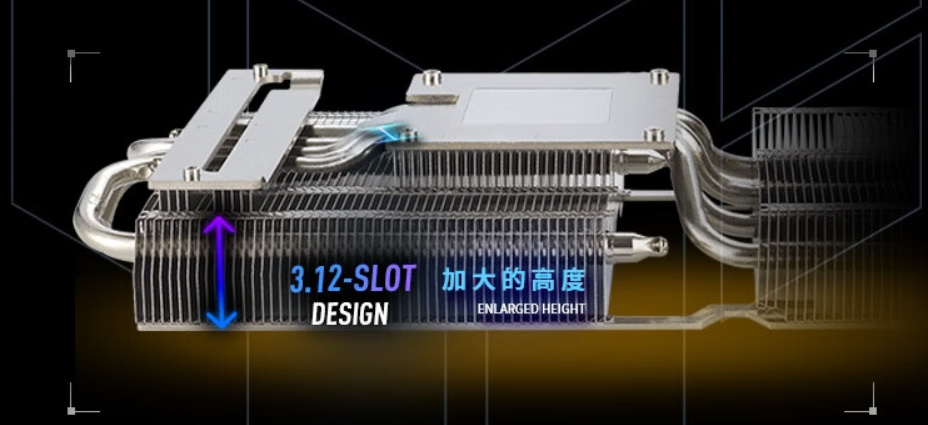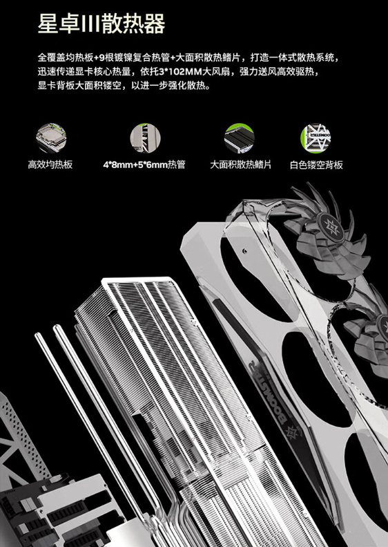 ▲做工方面,其使用的星卓散热器同样很优秀,采用了全覆盖均热板+9镀镍热管+大面积鳍片的组合,佐以3个203mm大风扇,能够有效为显卡提供散热。
