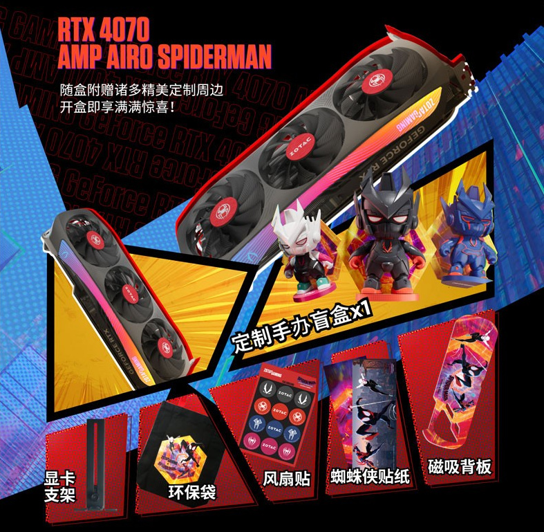 ▲文章的最后,再推荐一款刚刚发售的索泰(ZOTAC)GeForce RTX 4070 - 12GB 天启 OC AMP AIRO SPIDERM,这是索泰与漫威蜘蛛侠联名的一款显卡。