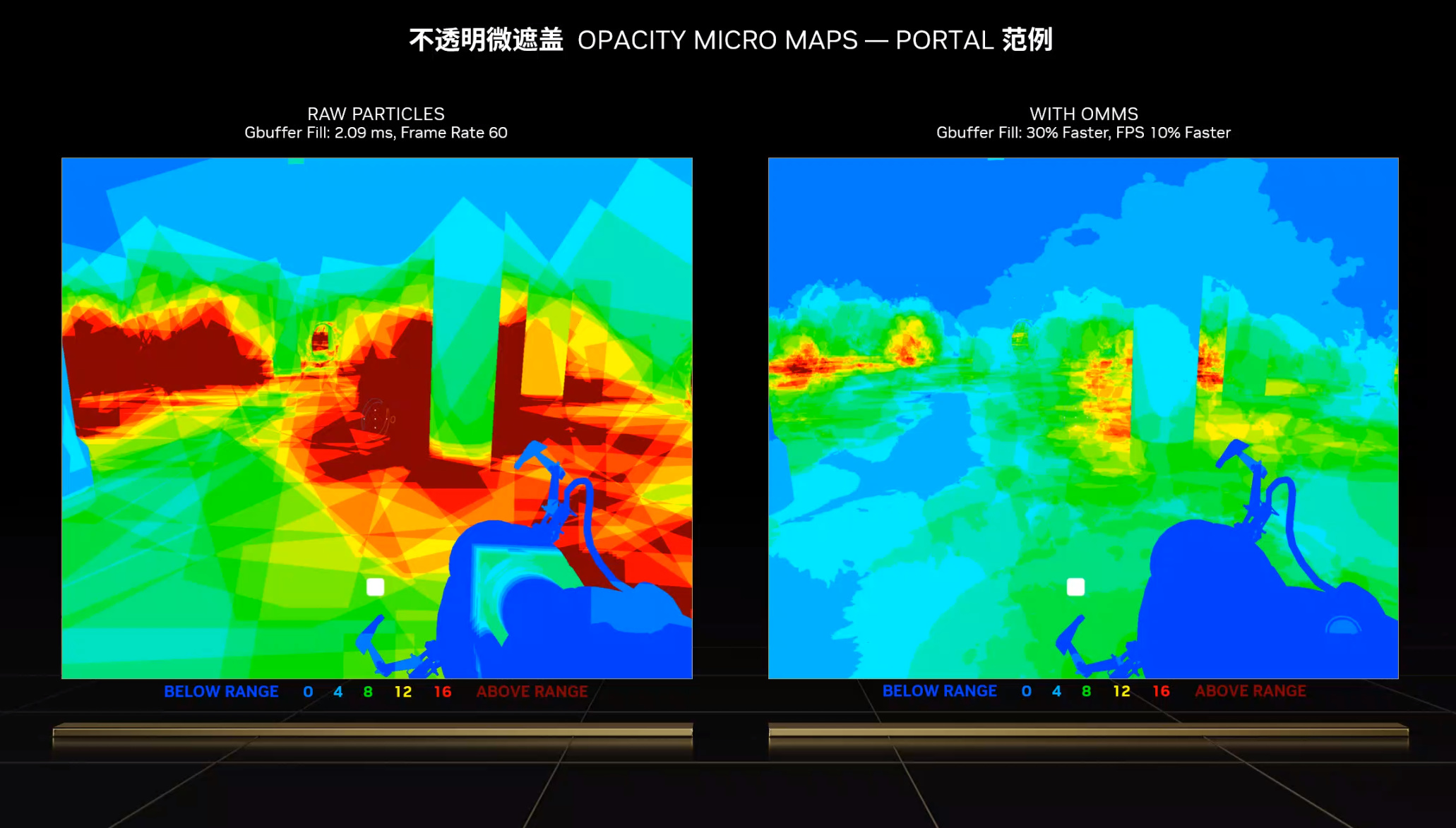 ▲左侧为未开启OMM引擎时的着色器工作量,右侧为OMM引擎开启后的着色器工作量,可见OMM的性能立竿见影。
