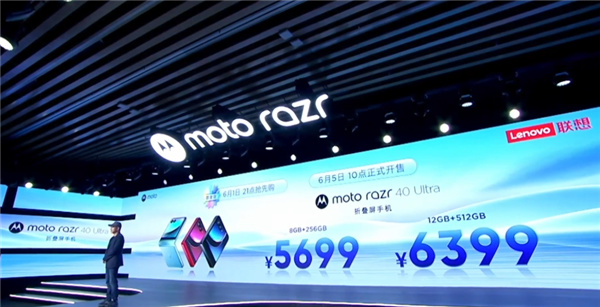 价格上,moto razr 40 Ultra 8GB+256GB售价5699元、12GB+512GB售价6399元,今晚21:00抢先购,6月5日10:00正式开售。