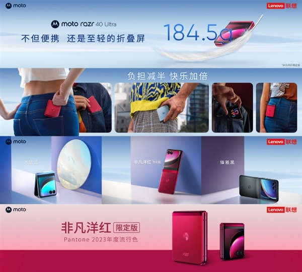 其他方面,moto razr 40 Ultra采用第四代星轨转轴,40万次折叠寿命,展开机身厚度为6.99mm,折叠时机身厚15.1mm,重量约184.5g,拥有峰雅黑、冰晶蓝、非凡洋红限定版3款配色。