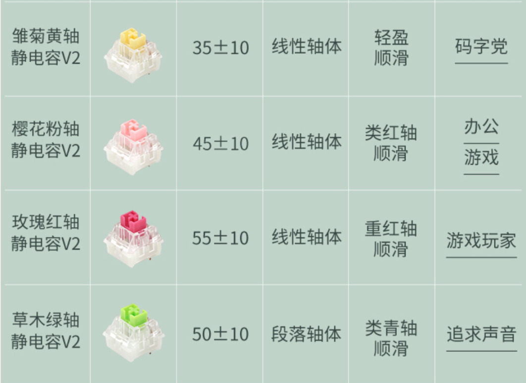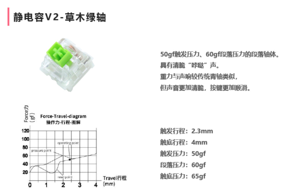 作为当年直接抗衡 cherry 轴的阿米洛静电容轴,相比老牌贵族 HHKB 的常规静电容敲击时的机械感更足,同时因为本质是无触点触发,寿命近乎无穷。草木绿轴基础规格极为接近 cherry 青轴,具体数据如下