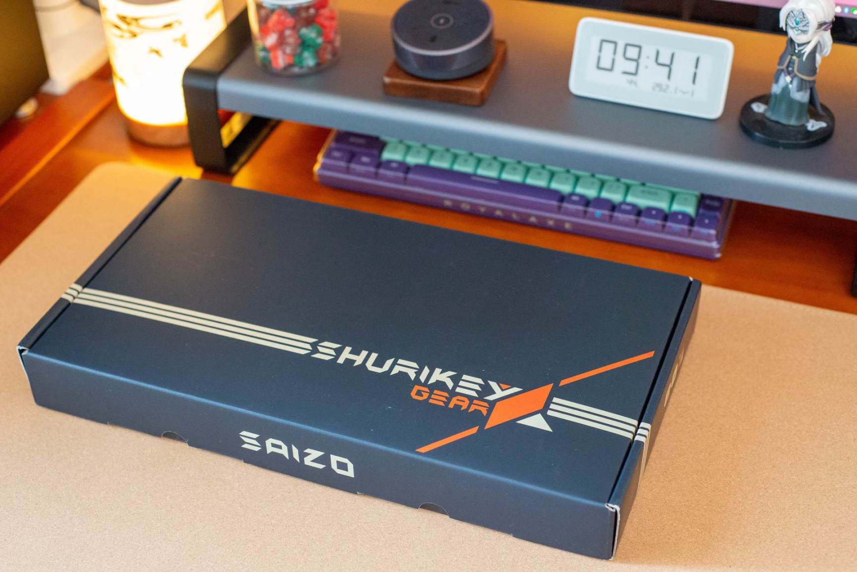 ▼包装并不复杂,黑色主色调,黄色红色线条勾勒品牌英文标示“Shurikey”,侧方则是键盘型号“saizo”。