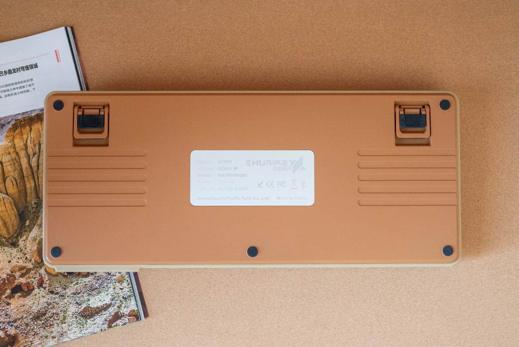 ▼橙色键盘底壳,中间是块印有常规信息的金属铭牌,两边分布 5 条下凹装饰条,边缘分布 5 颗 黑色圆形防滑脚垫,尺寸虽小,抓地效果不错。上方则是收纳式脚撑,两段高度调节,上面同样有黑色防滑脚垫。