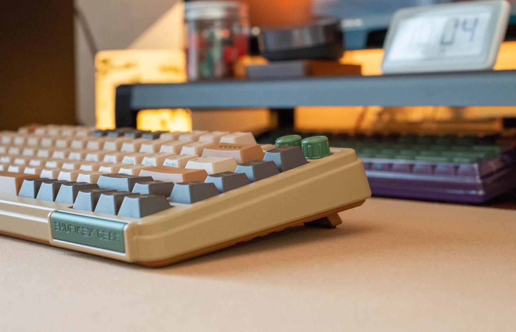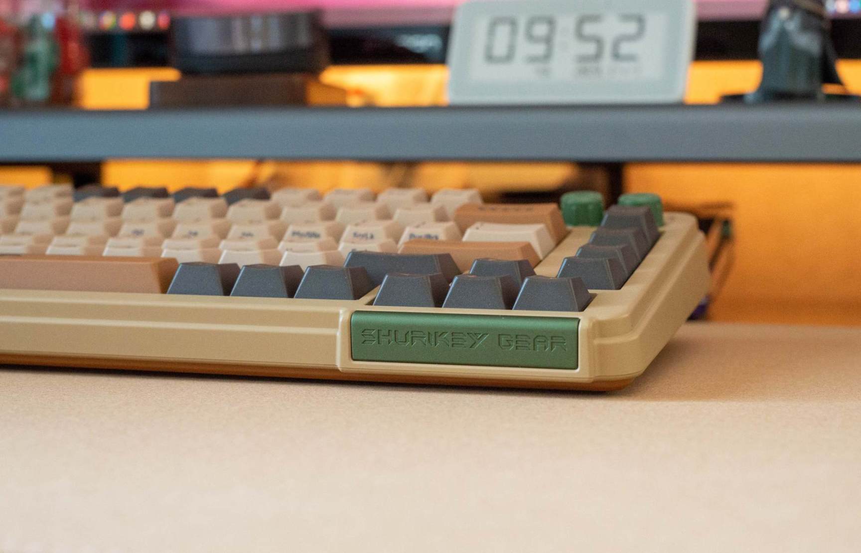 ▼键盘外形很有特色,古拙的造型设计,充满年代感的灰粽绿配色,边缘的线条弧度也是那种粗犷的工业风,有种 一 秒回到 80 年代的错觉。