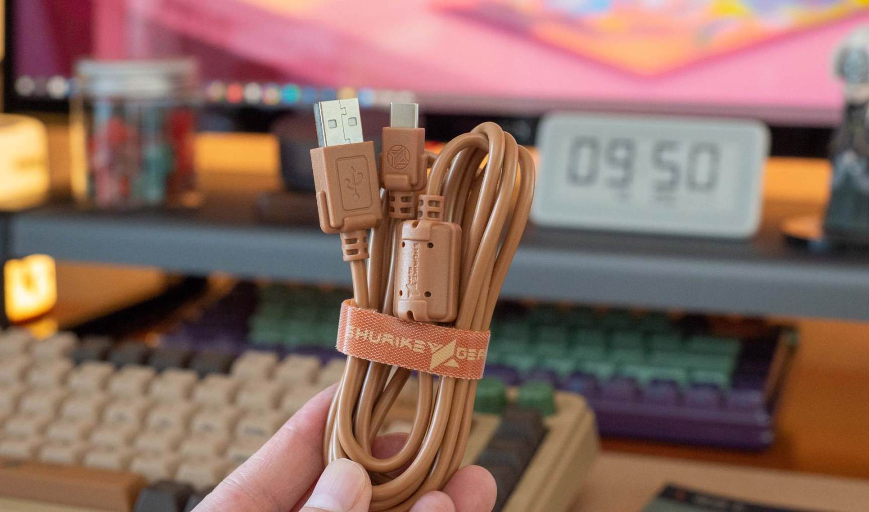 ▼连接的线材不仅和键盘同色,两边的插头和屏蔽环也专门设计为键盘同风格,插头、扎带上都是品牌 LOGO ,细节真的到位。