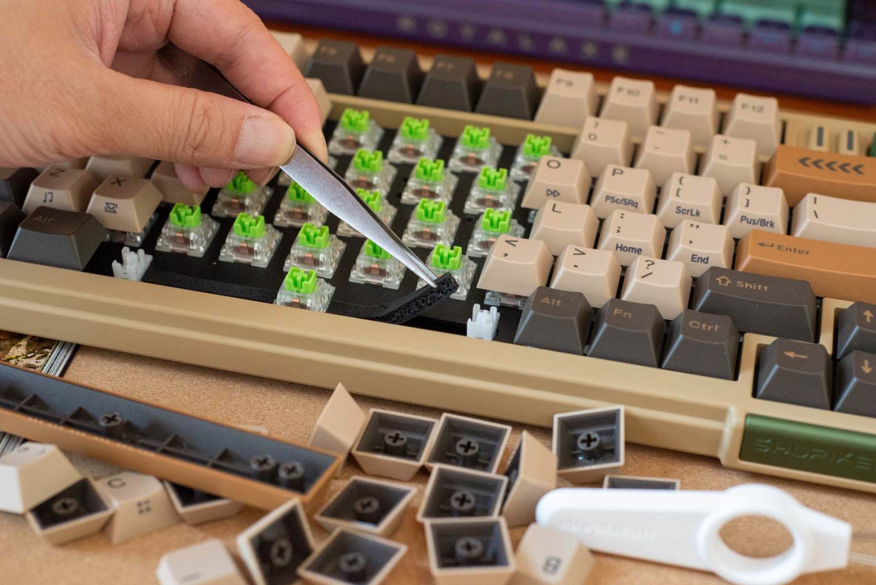 ▼顺带一提,这把键盘的大键位调教的非常好,卫星轴出厂前也做了手工微润,加上底部的消音垫,敲击时几乎听不到空腔音,不同区域按压一致性也做的不错。个人觉得,线性轴其实大家都差不多,考验工艺水平和手感还是得看段落轴,这个草木绿轴真的满足了我对静电容轴的大部分期待,大家有机会入手静电容轴的话一定要试试这个草木绿轴。
