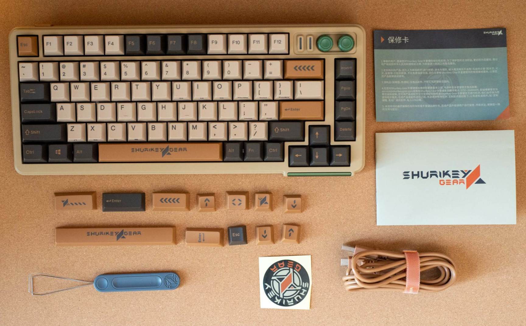 ▼配件方面包括键盘本体、防尘罩、Type-C 数据线、钢丝拔键器、个性增补键帽、LOGO贴纸,以及合格证、保修卡、说明书等等。配件丰富度中规中矩,但增补键帽给的比较良心,足足 12 颗。