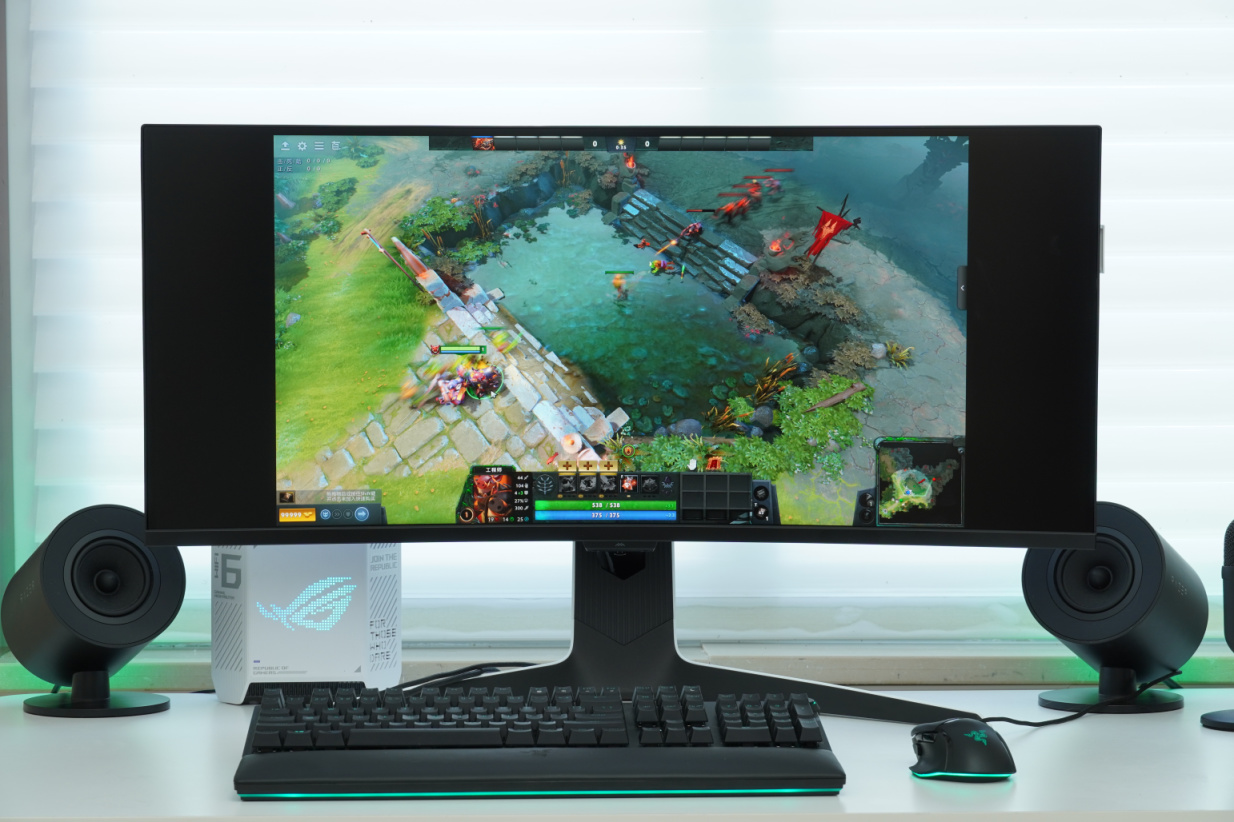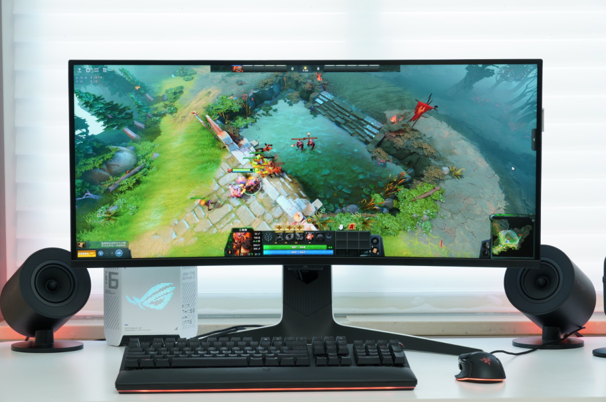雷鸟Q8的定位是电竞显示器,这里自然先拿游戏来说事情,21:9的带鱼屏显示器显示的画面面积比16:9显示屏多31.25%,游戏视野更广,帮助玩家更早发现敌人,避免被偷袭,进而大幅提升胜率。