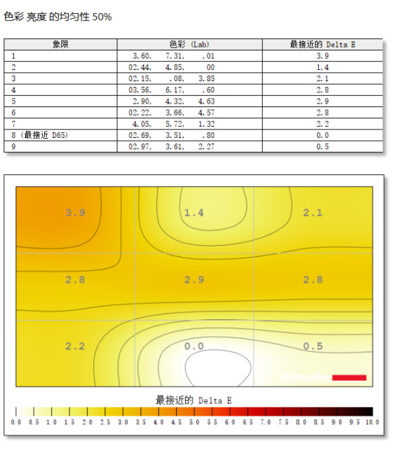 ▲在50%亮度,色彩均匀性方面,最大值仅为3.9,在屏幕的左上角,整体表现非常之好。