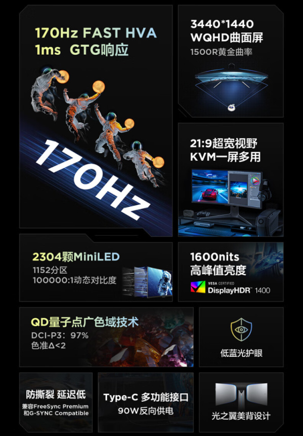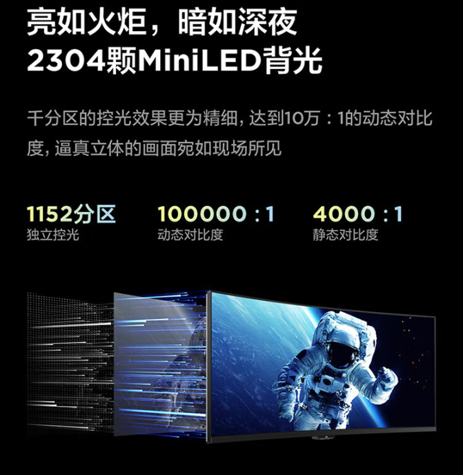 背光方面,总计2304颗MiniLED单元组成了1152个背光分区,可以提供100000:1的动态对比度与1600nits的峰值亮度,并获得了VESA DisplayHDR 1400认证。
