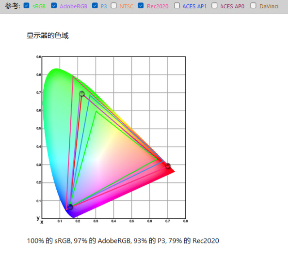 ▲在情景模式-标准(最大色域)下,雷鸟 Q8拥有100%sRGB,97%的AdobeRGB,93%的DCI-P3,79% Rec 2020色域覆盖,与官方标注无疑,部分表现甚至高于官方标注。当然,如果要测某色域覆盖,最好还是切换到对应的色彩模式下进行,雷鸟Q8 除了拥有标注(最大色域)之外,还有sRGB、AdobeRGB、DCI-P3色域对应的情景模式,另外还有针对游戏的FPS模式、RPG模式、RCG模式,以及针对办公与观影使用的电影模式、护眼模式与电纸书模式,足以满足绝大多数用户的场景需求。