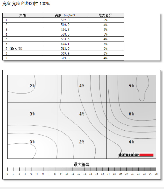 ▲在亮度均匀度方面,雷鸟Q8的表现也很好,最大的偏差也仅为9%,其实大家可以发现,整个显示器亮度均在550nit左右,从这点来讲,雷鸟自研的MiniLed控光技术表现可以说非常好!大厂的气量,都是在这些细节上流露出来的。
