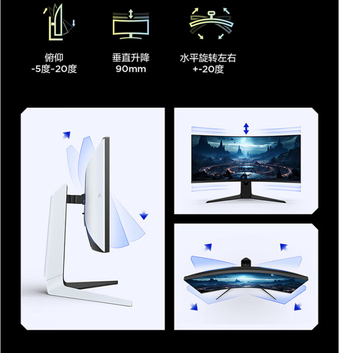▲这款支架还支持显示器-5°~20°的俯仰调节与±20°的左右旋转,以及90mm的垂直升降。