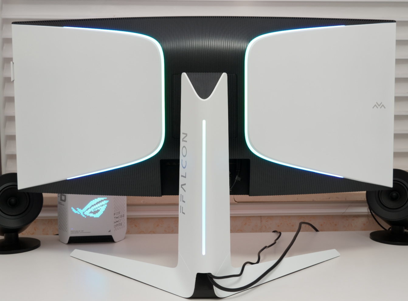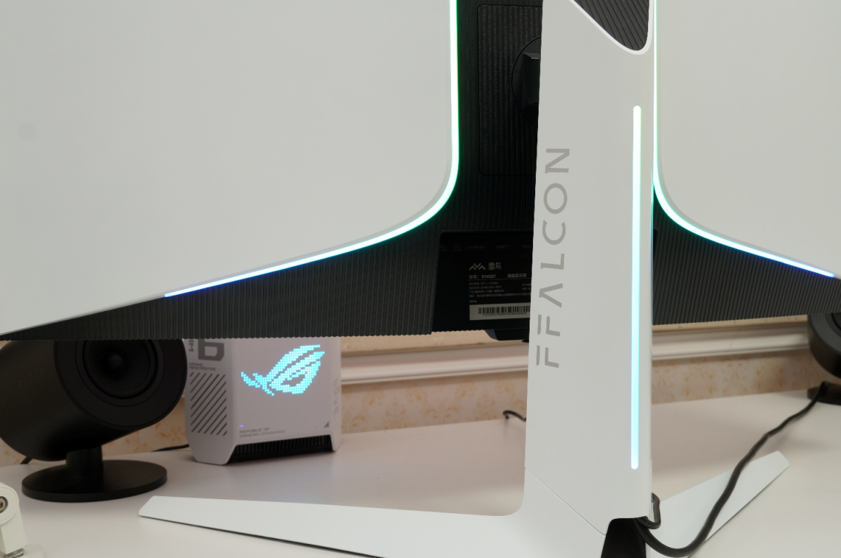 ▲首先雷鸟Q8的V形电竞支架做工用料都非常棒,即使为34英寸带鱼屏提供支撑,依旧能够给人很足的安心感,其上的RGB氛围灯有多种模式可调节,支架内设有隐藏走线通道,能够让桌面显得更加简洁。
