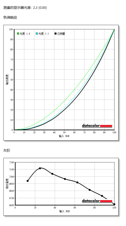 ▲色调响应上,实测伽马值为2.3,灰阶最终略在了6600K,十分接近D65(6500K)标准色温了。