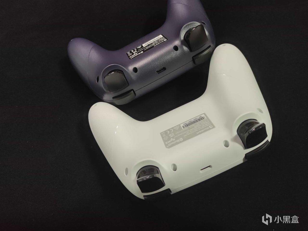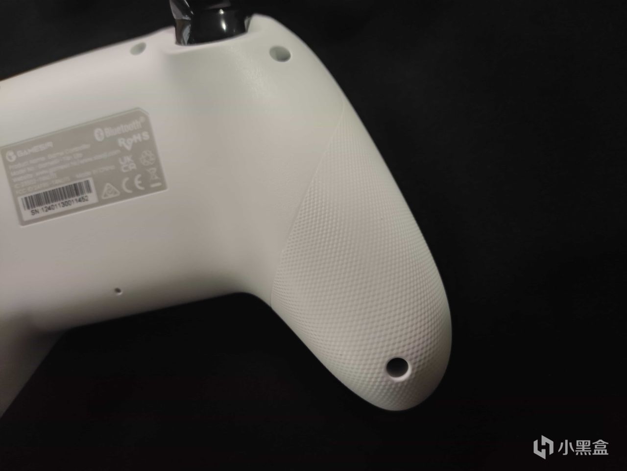 手柄的扳机扳机部分相比于xbox的手柄相对来说小了一些,这款手柄没有背键。背部的磨砂纹路和xbox也基本相同。