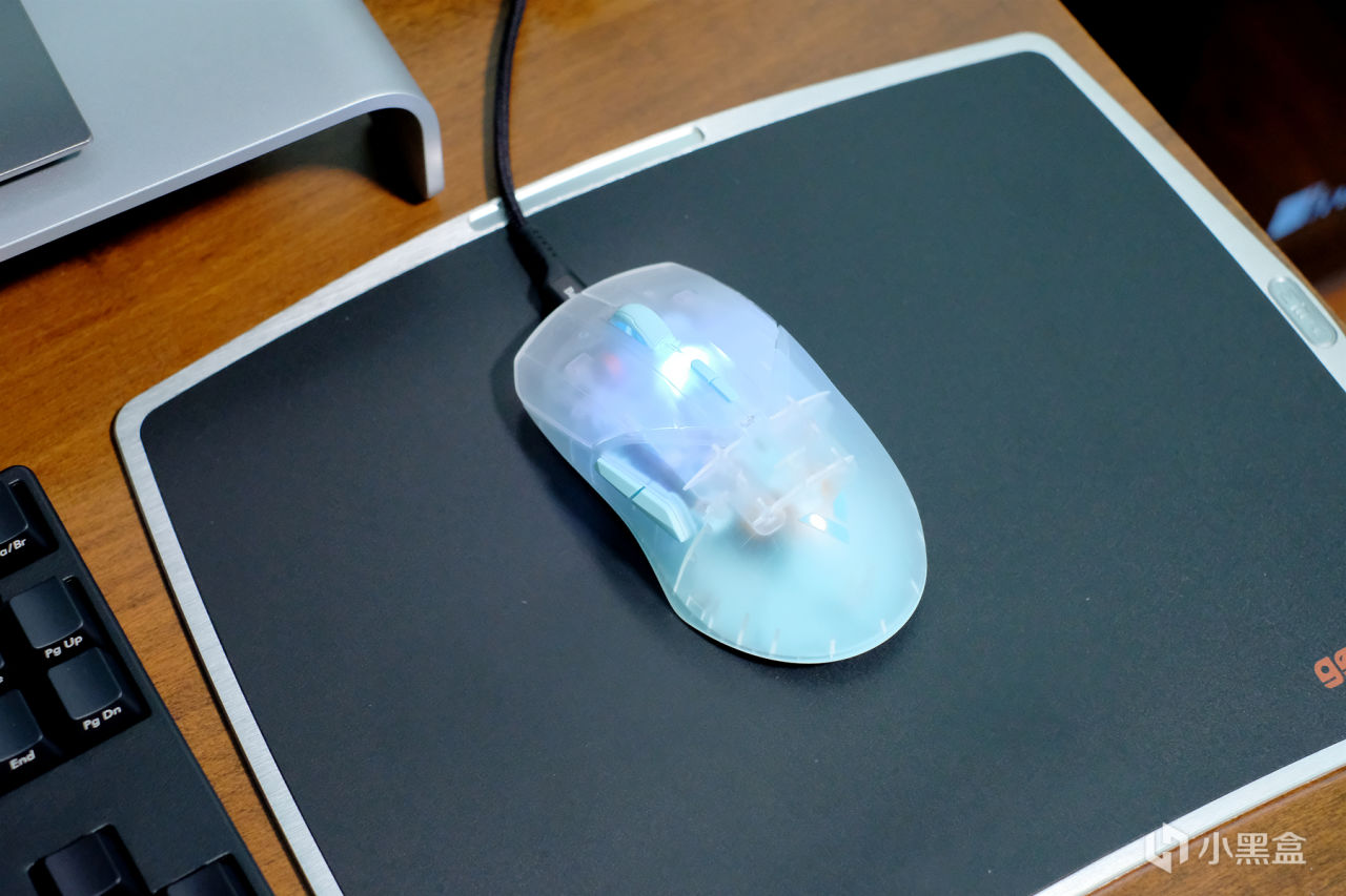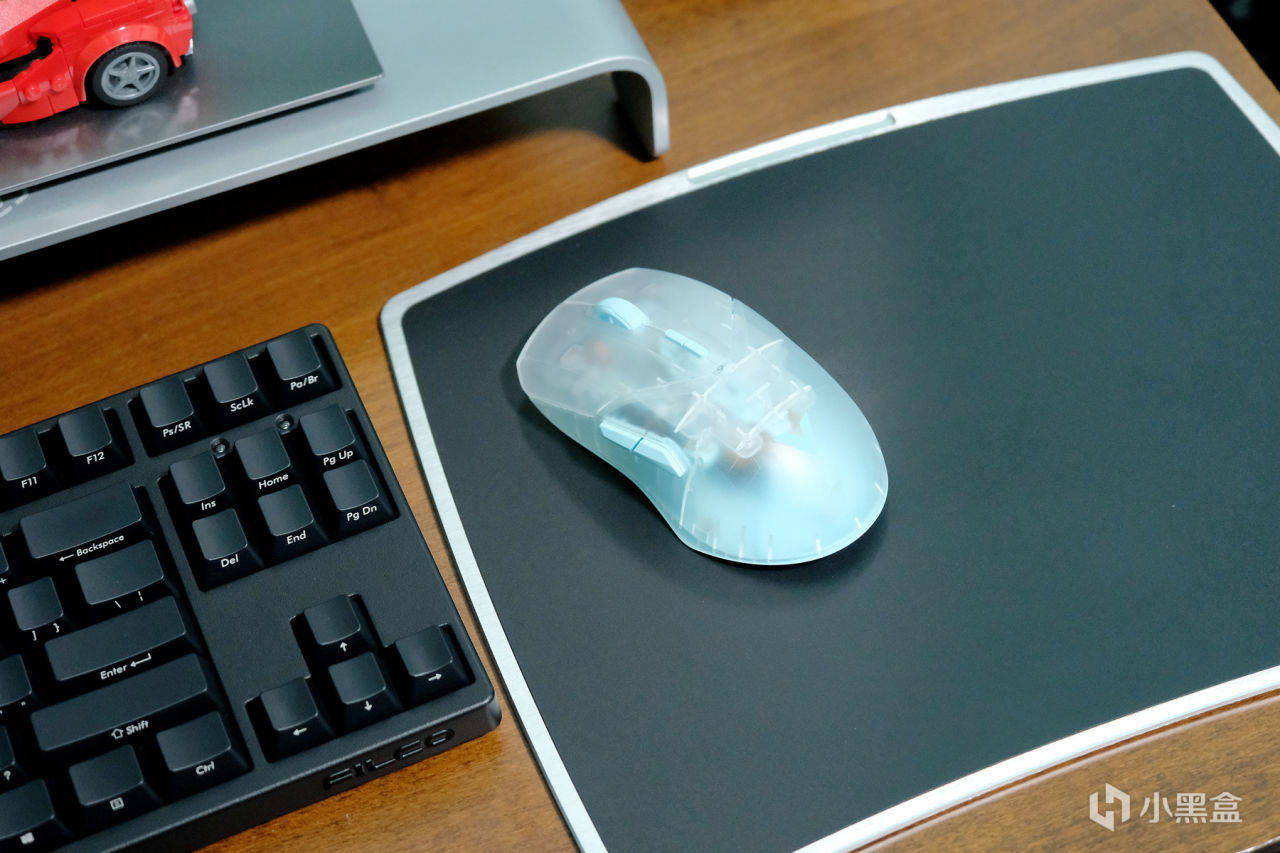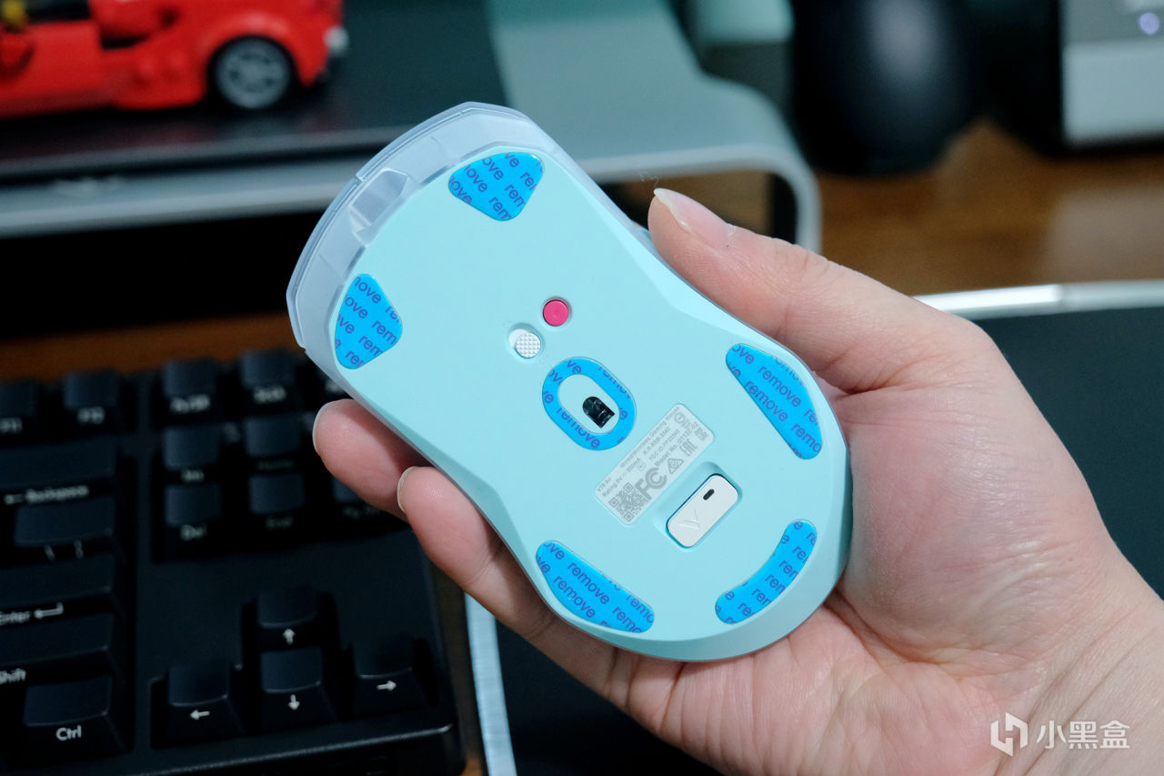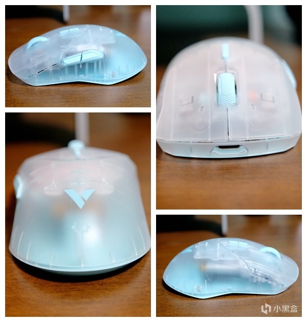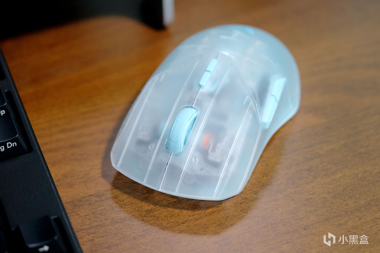 Air的外观设计依然延续了VT9系列的经典设计,区别在外壳采用的是半透材质,表层采用的是磨砂工艺,楼主选择的是透明蓝的配色,鼠标整体的颜值和质感都非常不错,性能方面搭载3398光学引擎,支持650IPS追踪速度及50G加速度,50-26000DPI可7档调节,具备无线4K/有线8K的高速回报率,三围大小为:120*65.7*37.5mm,属于中小型鼠▼