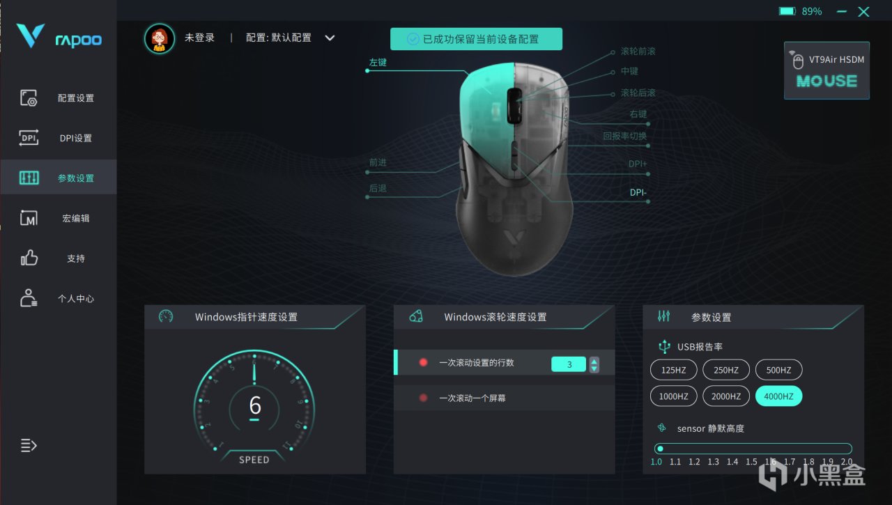 雷柏的驱动界面设计得较为简洁,功能设置也能够一目了然,使用无线连接的情况下USB的报告率可设置为4000Hz,相对于普通鼠标的1000Hz在体验上会感到更为丝滑精准快捷▼