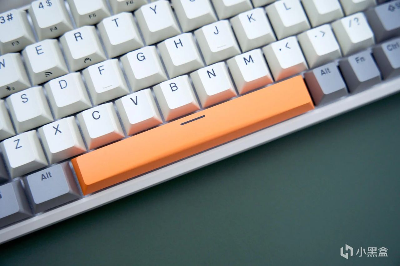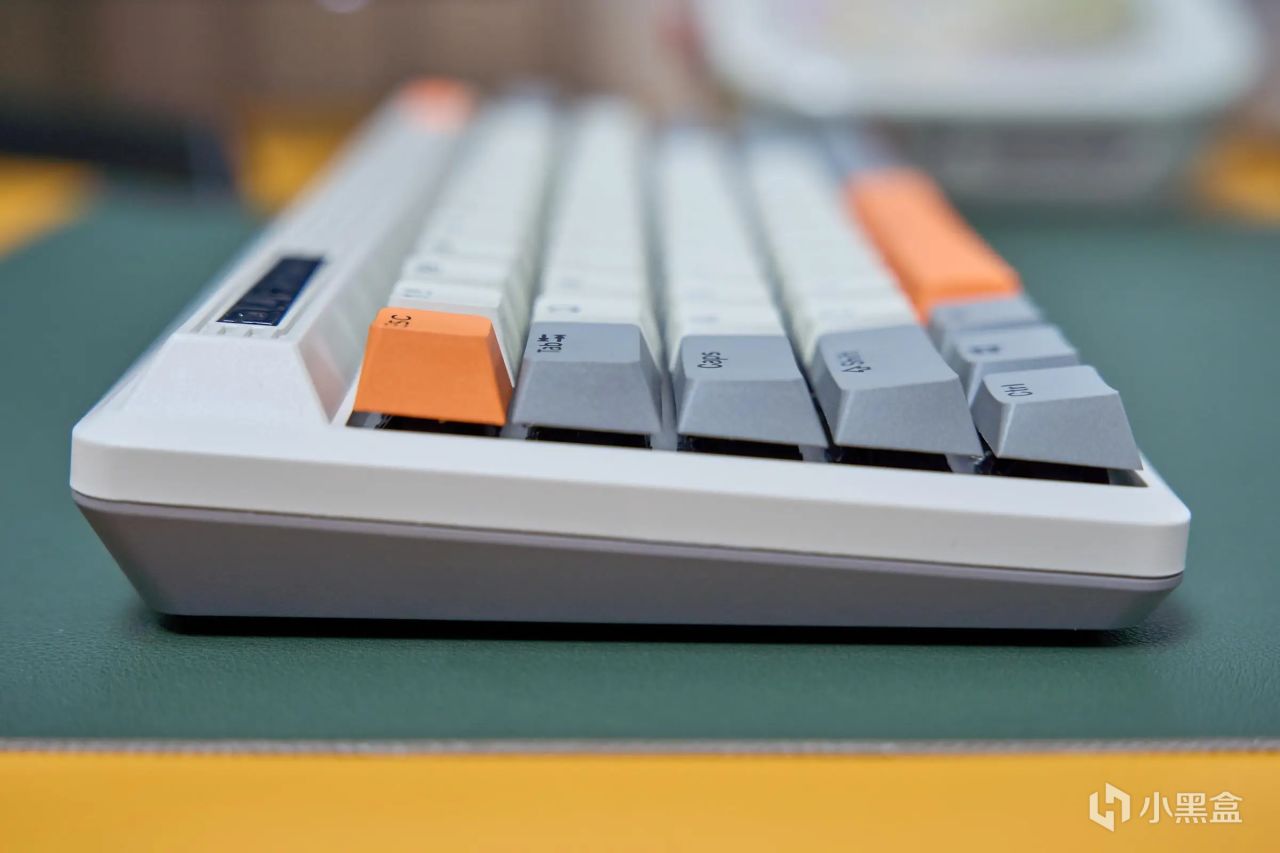 说回到手感的核心——按键。68颗键帽都是原厂高度,从侧面看整张键盘严格保留了符合人体工学的弧面高度,让长时间打字保持住轻盈手感。