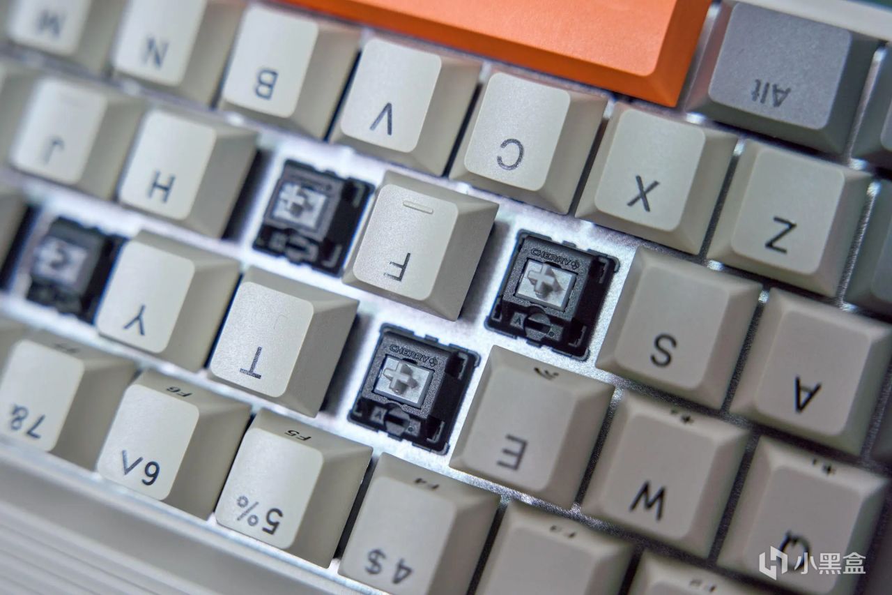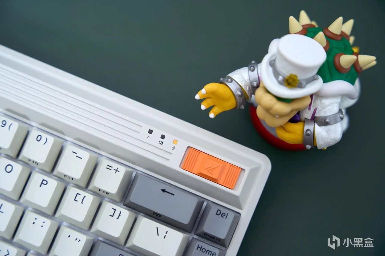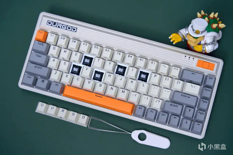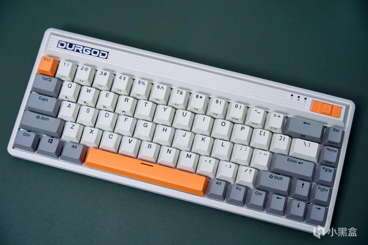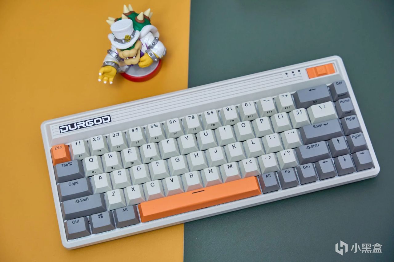我手里这款是杜伽FUSION的复古白版本。整体白、灰、橙三色与记忆中80年代电子游戏的印象吻合。那橙色键帽特别像《超级玛丽》里的砖块有木有?!