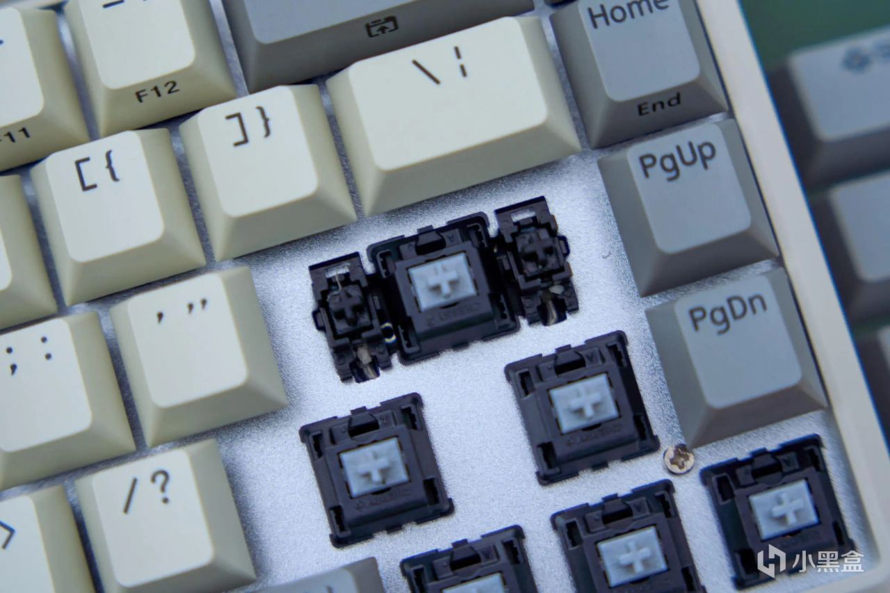 在手感调教上,键帽下方的纯铝衬板熠熠生辉,无不在提醒用户键盘减重变轻但是手感支撑性绝不含糊的秘密。大键位的卫星轴也是出厂调教润滑过的,大粒润滑油看见没?