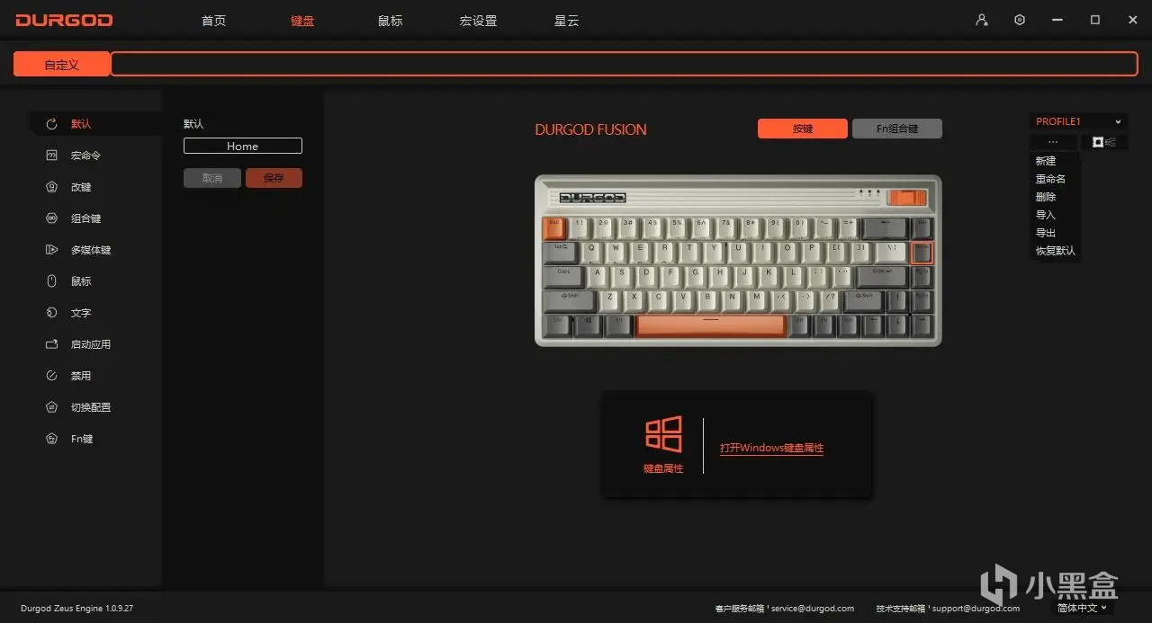 FUSION的按键支持全键无冲,如果你恰好安装了杜伽官方宙斯驱动软件(DURGOD ZEUS ENGING),还能自定义宏,并设置专属配置文件。