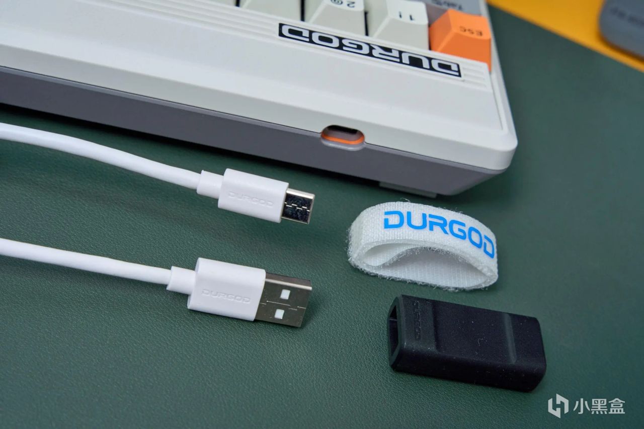 FUSION的数据供电口位于键盘侧面左上方。杜伽贴心的标配2根线材,C to C和C to A各一根,再附送一个C to A的转接头,连收纳线材的魔术贴扎带都给,真是好用心。