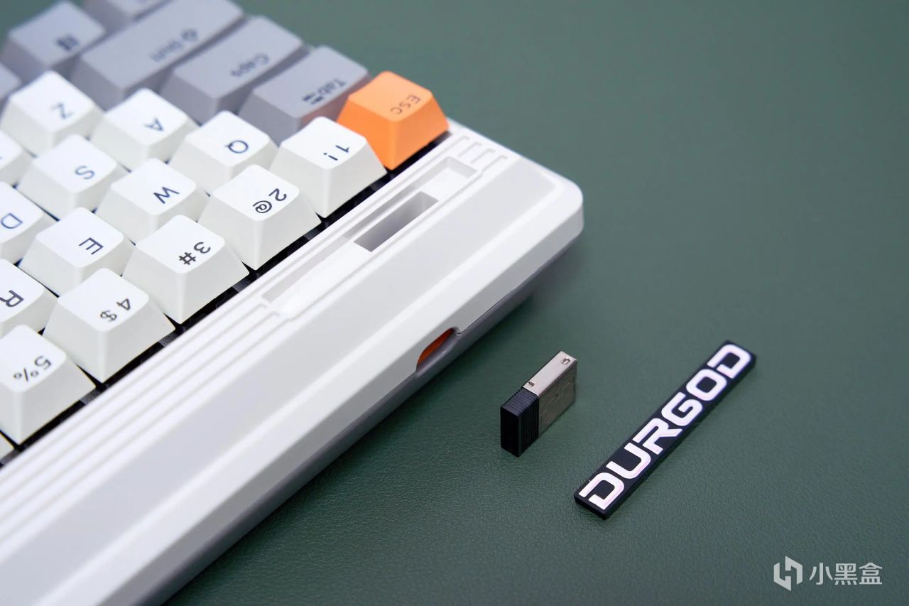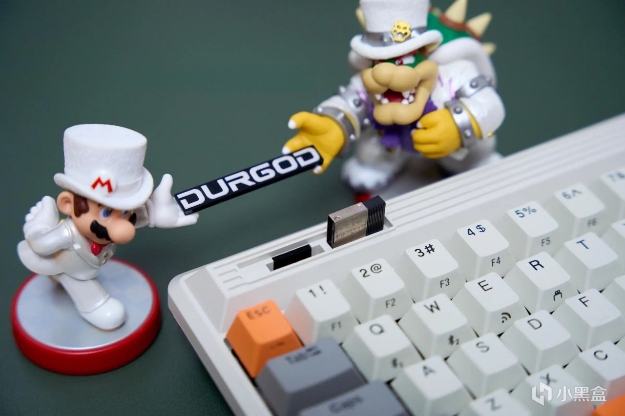 键盘键区上方的塑料外壳是凸起的,顶部右侧是滑动开关,左侧是“DURGOD”品牌logo铭牌。
