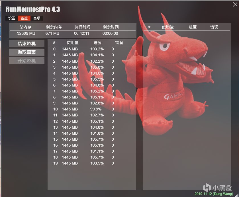 同时我也注意到这对内存条标称6000频率故此我也多加测一项Runmemtest,测试其在6000频率下的稳定性,可见在此频率下这对内存条依旧很稳。