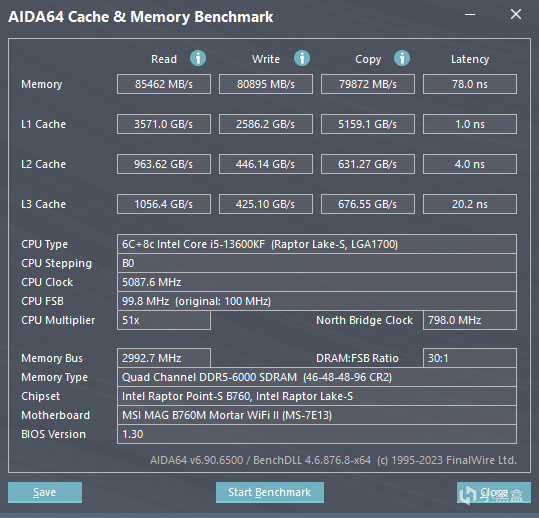 开启XMP后,内存的时序来到了46-48-48-96,此时频率来到了6000MHz,使用ADIA64做了跑分测试,读取为:85462MB/s,写入为80895MB/s,拷贝为79872MB/s,延迟降低到了78.0ns。与未开启XMP的数据对比发现,提升还是很大的。