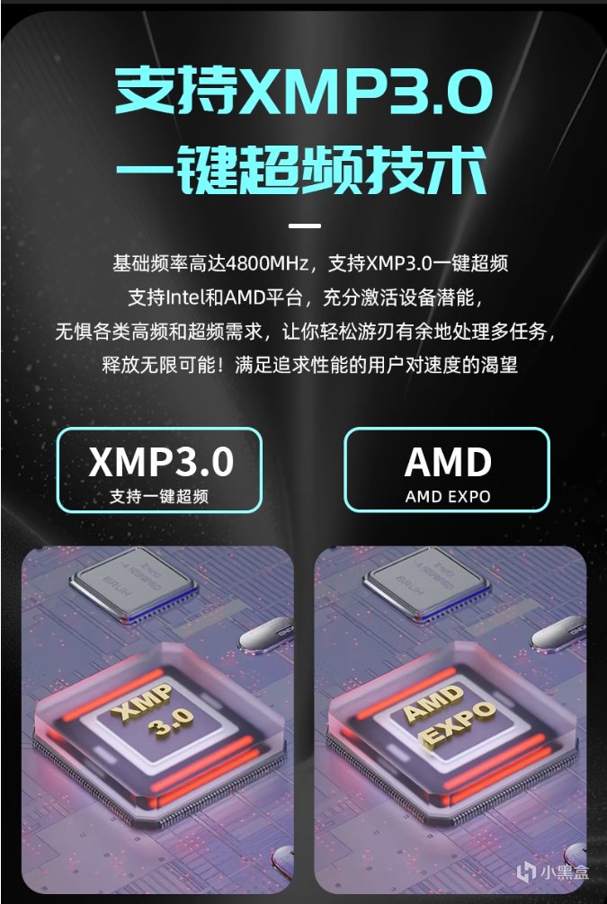 这款内存条的PCB是黑色的,这款内存配置了镁光颗粒,支持Intel XMP 3.0、EXPO技术,具备On-die ECC(片内指令纠错),能够保障内存在高频运行时的稳定运行。