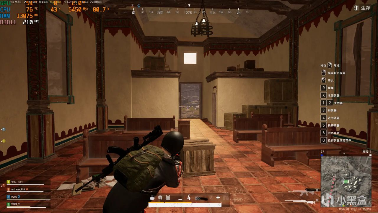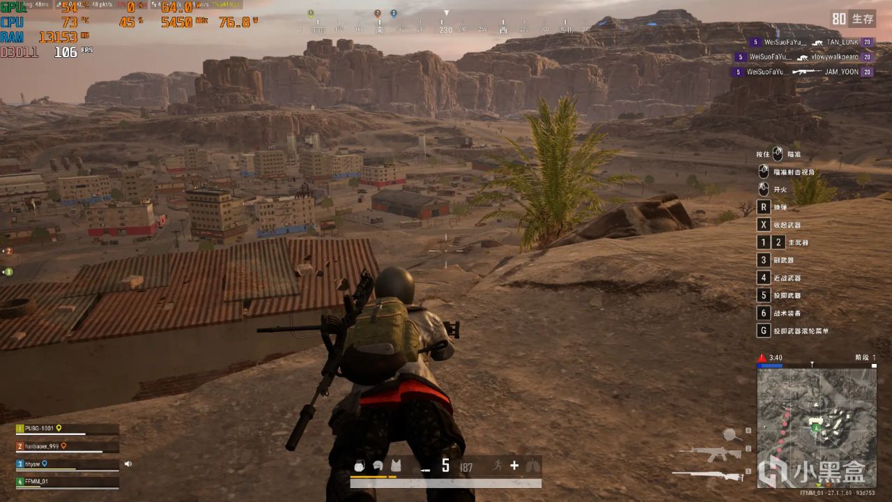 《绝地求生》2K分辨率+全特效画质+100%旋入,游戏帧数大概为80~100出头。