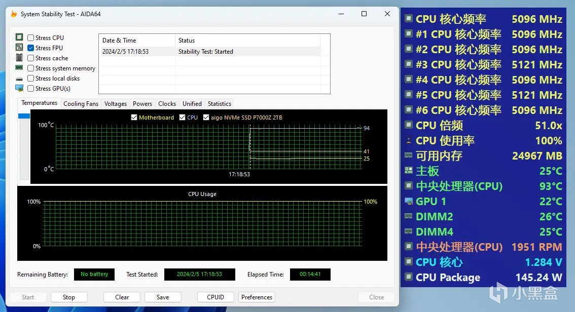 CPU在BIOS默认设置的状态下,核心电压为1.284V,功耗为145W左右,拷机温度为93℃。