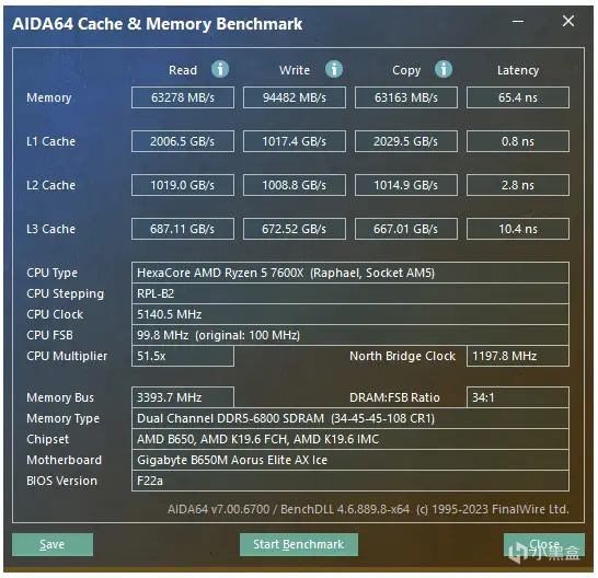 这时候内存的频率仍为6800MHz,但读写速度达到了63278MB/s,写入速度为94482MB/s,复制速度为63163MB/s,延迟为65.4ns,技嘉这个D5黑科技没有超频胜似超频,没有改动内存时序和频率读写和延迟都强化了不少。