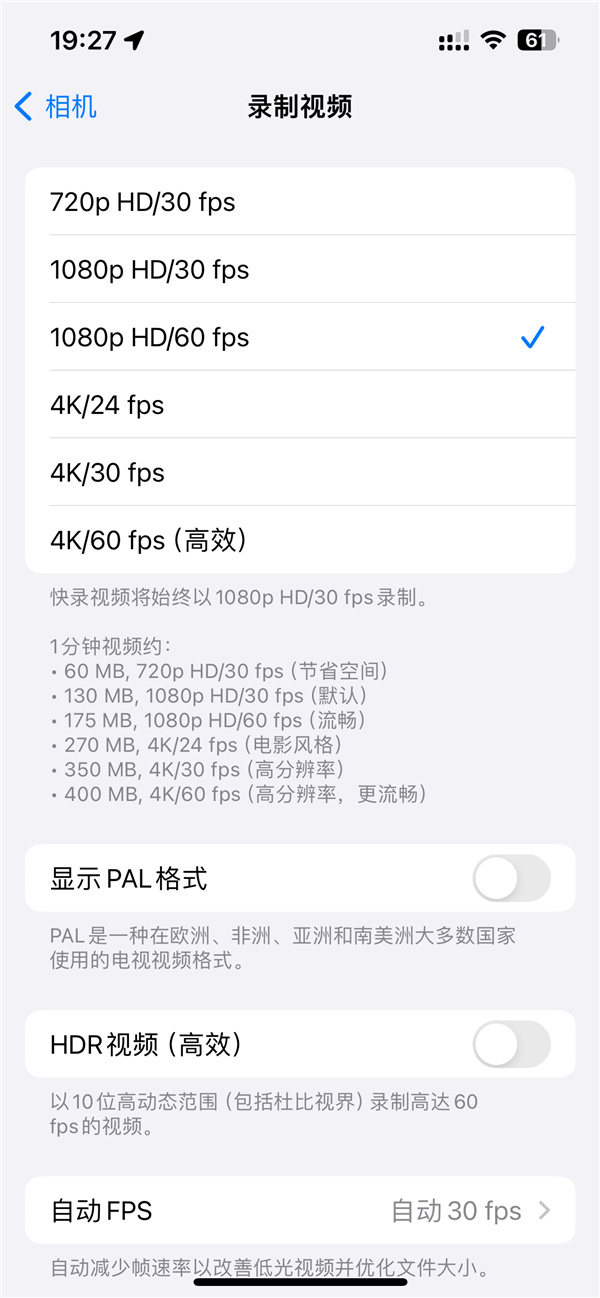首先,打开iPhone自带的相机,切换到“视频”模式,点击右上角参数,将分辨率调整为4K、帧数调至60fps。