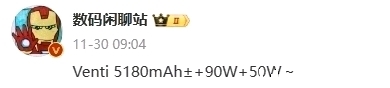 ◆ 电池容量:额定5180mAh,支持90瓦有线快充,50瓦无线快充;
