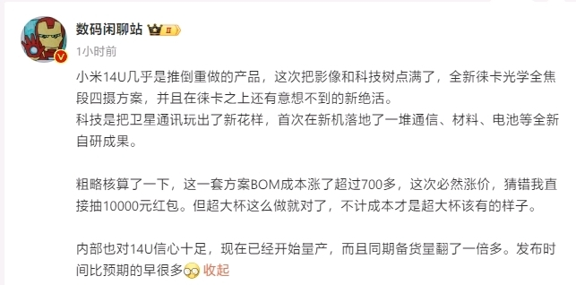成本及价格方面,其称经过粗略核算,这套方案 BOM成本涨幅超过 700 元,“必然涨价”。“不计成本才是超大杯该有的样子。”