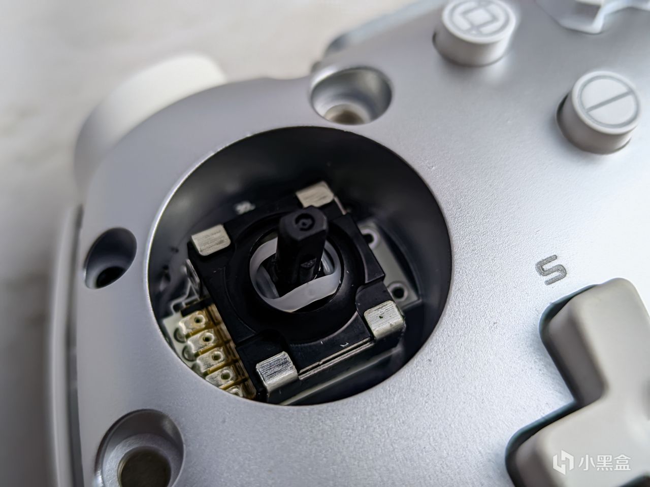 除去设计,其本身的硬件部分做的也算是这个价位不错的存在,摇杆部分采用了目前比较主流的霍尔摇杆,同时其在面盖上做了POM耐磨环设计,而蘑菇头和摇杆帽都可以单独拆卸,其中摇杆帽上配有可拆卸的耐磨金属环,两者相加,终于,特氟龙胶带不用加班了,毕竟完全没有缠绕的必要了。